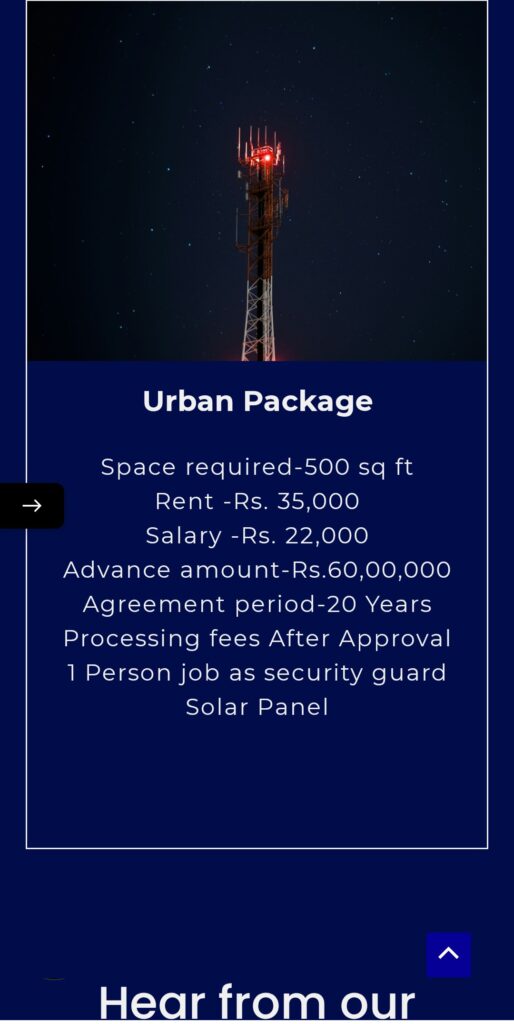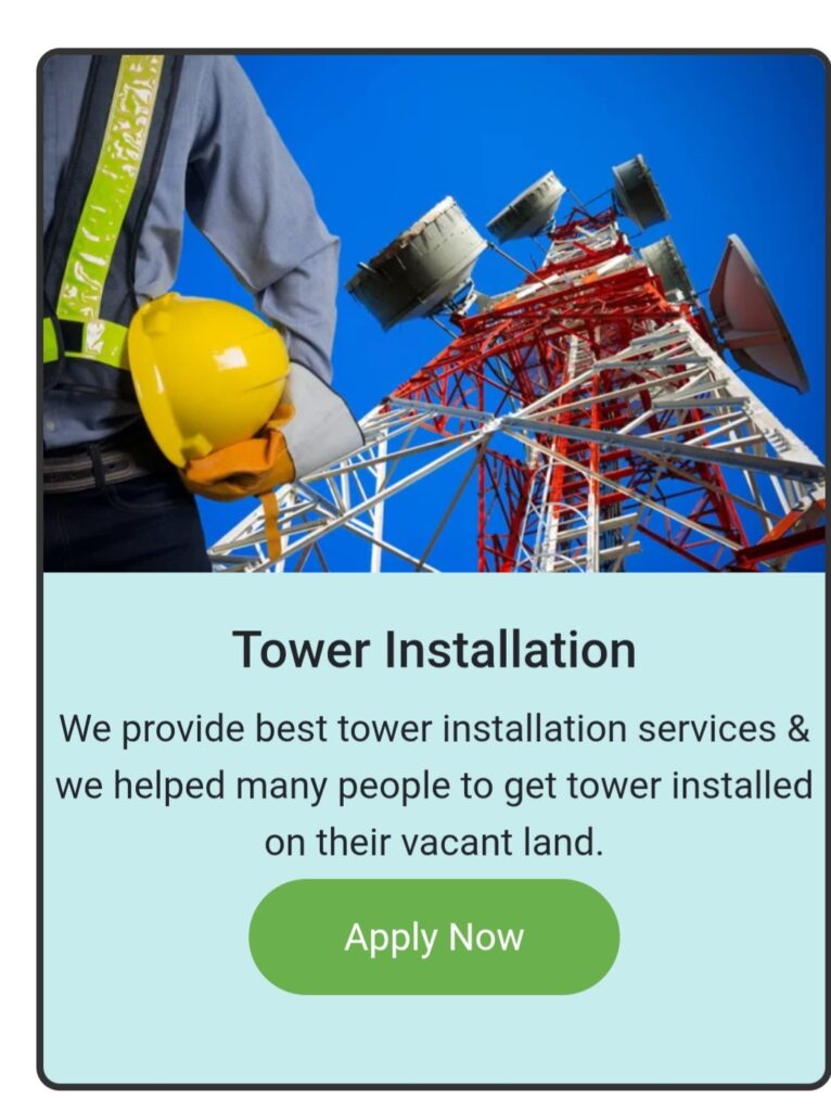 Apply for installing a mobile tower, you will have to submit some of your documents to the company Passport size photo Aadhar Card Property Proof After submitting these documents, the company will secretly inspect the place using technology. This is done keeping in mind the security and the towers of other companies. If your property is approved, the company will give you a rent of Rs 35,000 per month and security of Rs 60 lakh which will be given in 2 installments, the first installment will be of Rs 30 lakh for installing the tower and signing the agreement and the second installment will be of Rs 30 lakh which will be given after the completion of tower installation. Your 20 year court agreement will be done and your monthly rent will be increased by 05% every year. Your member will get a job salary of Rs 22,000/- per month for the maintenance of the tower. The age of the employee should be more than 18 years. After that some papers are prepared by the court and reach you within 24 hours